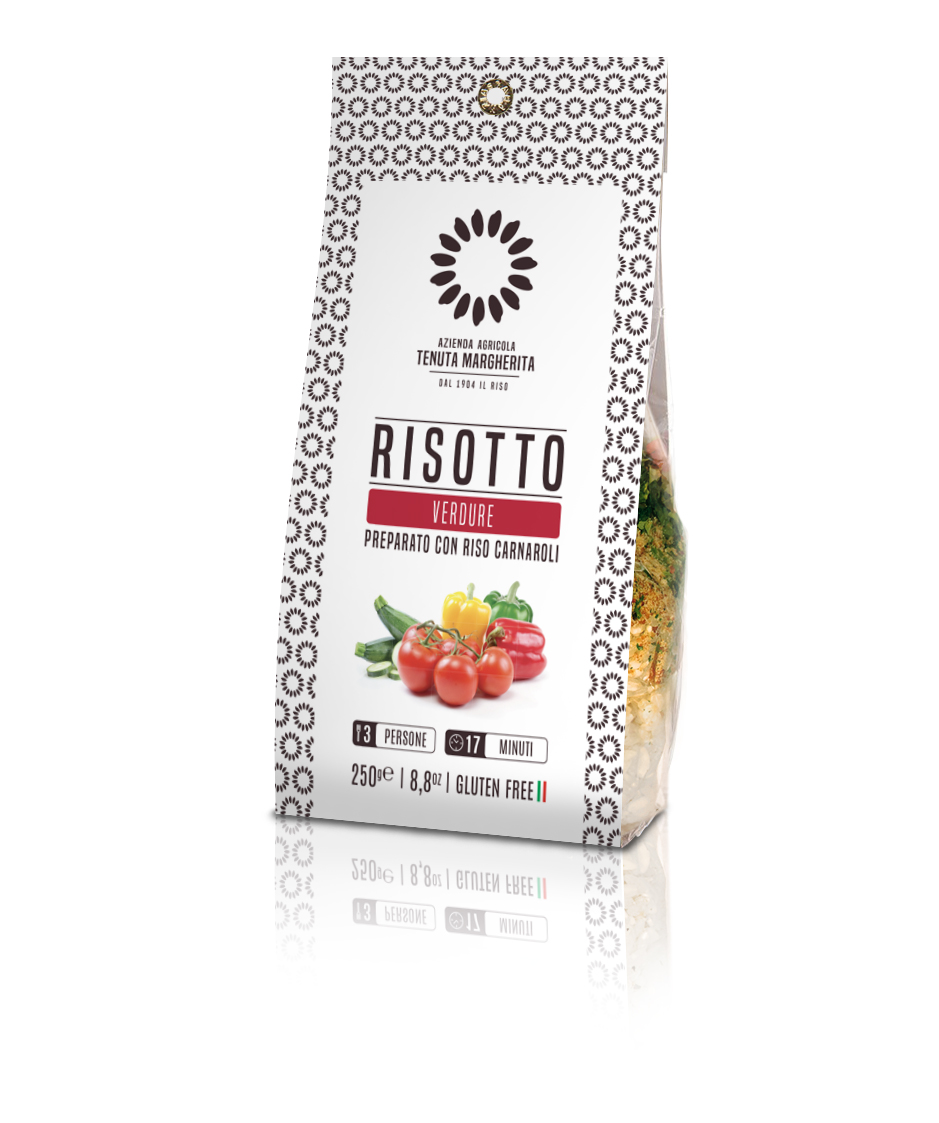 Koostisosad: carnaroli riis 92%, glutamaadivaba köögivilja maitseaine (sool, kartulijahu, pärmiekstrakt, kartuli maltodekstriin, dehüdreeritud köögiviljad (sibul, porgand, seller ja petersell), päevalilleõli, vürtsid ja looduslikud maitseained), paprika 2%. tomat 1%. suvikõrvits 1%, sibul, küüslauk, kurkum.